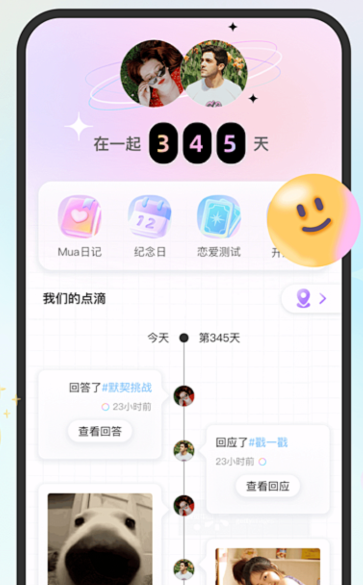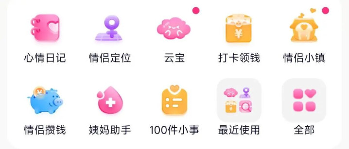 情感维系类:100件小事、恋爱任务打卡、纪念日成就、关系成长曲线。