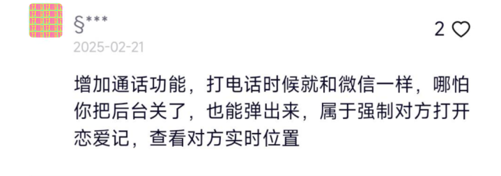 及时通讯:音视频电话功能。该功能并未上线,我猜测可能出于安全考虑吧。毕竟情侣关系,聊天沟通过程中有些小情趣的私密场景。你懂的。